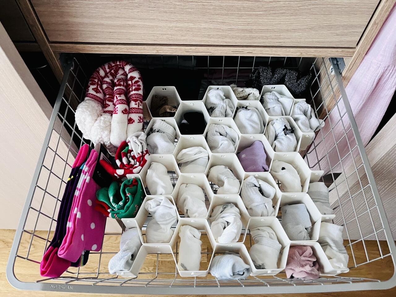 Kärjekujuline sahtli organiseerija sokkide, aluspesu ja muude väikeste esemete organiseerimiseks.